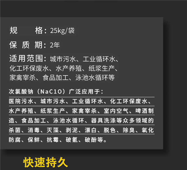 本產品還可用于工業漂白,高級洗衣粉,洗滌劑,去污粉等添加劑。而且還可做羊毛紡縮處理劑,皮毛加工的滅菌漂制等行業。另外它能有效的抑制細菌的繁殖和臭味的發生,很適合作家庭,公共場所,垃圾污物、便具,陰坑,水溝的消毒去臭劑。